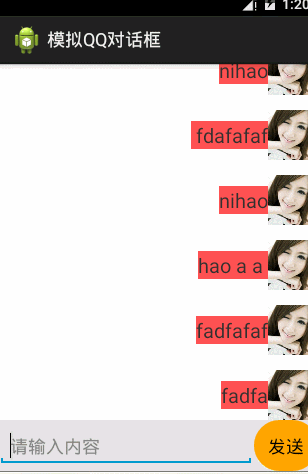 1 <RelativeLayout xmlns:android="http://schemas.android.com/apk/res/android" 2 xmlns:tools="http://schemas.android.com/tools" 3 android:layout_width="match_parent" 4 android:layout_height="match_parent" 5 tools:context="com.lixu.qqduihua.MainActivity" > 6 7 <ListView 8 android:id="@+id/lv" 9 android:layout_width="match_parent" 10 android:layout_height="wrap_content" 11 android:layout_above="@+id/commentLinearLayout" 12 android:layout_alignParentTop="true" 13 android:divider="@android:color/transparent" 14 android:dividerHeight="15dip" 15 android:scrollbars="none" /> 16 17 <LinearLayout 18 android:id="@+id/commentLinearLayout" 19 android:layout_width="match_parent" 20 android:layout_height="wrap_content" 21 android:layout_alignParentBottom="true" 22 android:background="#e0e0e0" 23 android:orientation="horizontal" > 24 25 <EditText 26 android:id="@+id/et1" 27 android:layout_width="wrap_content" 28 android:layout_height="wrap_content" 29 android:layout_weight="2" 30 android:ems="10" 31 android:hint="請輸入內容" > 32 33 <requestFocus /> 34 </EditText> 35 36 <Button 37 android:id="@+id/btn1" 38 android:layout_width="wrap_content" 39 android:layout_height="wrap_content" 40 android:background="@drawable/round" 41 android:text="發送" /> 42 </LinearLayout> 43 44 </RelativeLayout>