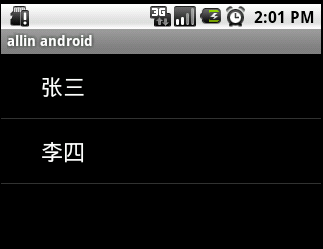 上面代碼使用了ArrayAdapter(Context context, int textViewResourceId, List<T> objects)來裝配數據,要裝配這些數據就需要一個連接ListView視圖對象和數組數據的適配器來兩者的適配工作,ArrayAdapter的構造需要三個參數,依次為this,布局文件(注意這裡的布局文件描述的是列表的每一行的布局,android.R.layout.simple_list_item_1是系統定義好的布局文件只顯示一行文字,數據源(一個List集合)。同時用setAdapter()完成適配的最後工作。運行後的現實結構如下圖: