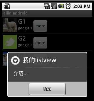 系統顯示列表時,首先實例化一個適配器(這裡將實例化自定義的適配器)。當手動完成適配時,必須手動映射數據,這需要重寫getView()方法。系統在繪制列表的每一行的時候將調用此方法。getView()有三個參數,position表示將顯示的是第幾行,covertView是從布局文件中inflate來的布局。我們用LayoutInflater的方法將定義好的vlist2.xml文件提取成View實例用來顯示。然後將xml文件中的各個組件實例化(簡單的findViewById()方法)。這樣便可以將數據對應到各個組件上了。但是按鈕為了響應點擊事件,需要為它添加點擊監聽器,這樣就能捕獲點擊事件。至此一個自定義的listView就完成了,現在讓我們回過頭從新審視這個過程。系統要繪制ListView了,他首先獲得要繪制的這個列表的長度,然後開始繪制第一行,怎麼繪制呢?調用getView()函數。在這個函數裡面首先獲得一個View(實際上是一個ViewGroup),然後再實例並設置各個組件,顯示之。好了,繪制完這一行了。那再繪制下一行,直到繪完為止。在實際的運行過程中會發現listView的每一行沒有焦點了,這是因為Button搶奪了listView的焦點,只要布局文件中將Button設置為沒有焦點就OK了。