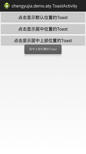 Toast toast = Toast.makeText(this, "居中上部位置的Toast", Toast.LENGTH_LONG);