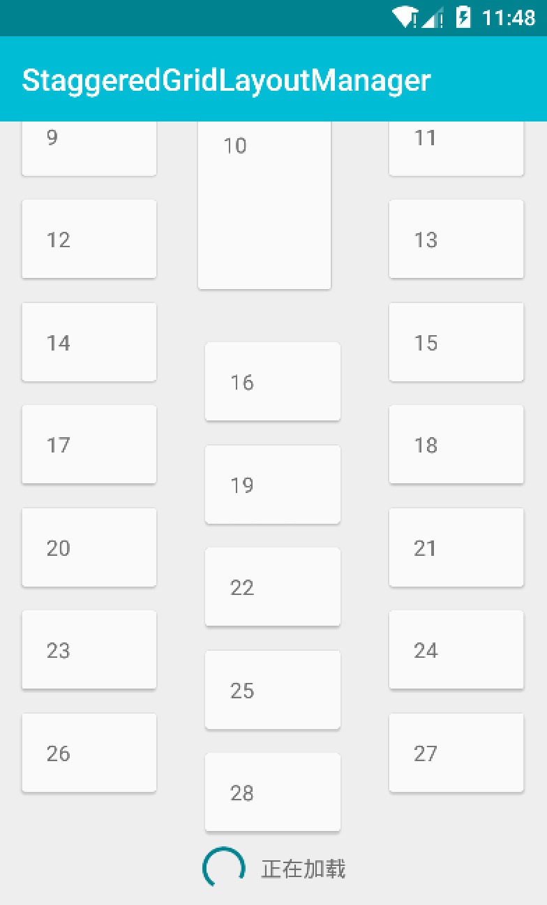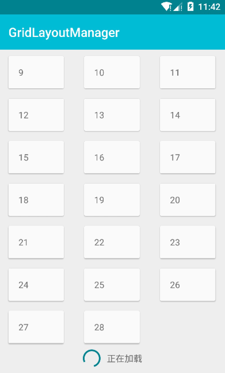 根據ItemViewType創建兩種布局,一個用於顯示正常內容的布局,一個用於加載布局,然後監聽RecycleView的滾動事件,當滑動到底部時添加加載布局,對於列表布局來說很簡單,不再熬述,然而對於網格布局與瀑布流布局來說,要解決"加載布局只占用一列"的問題,
