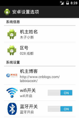 1 <?xml version="1.0" encoding="utf-8"?> 2 <PreferenceScreen xmlns:android="http://schemas.android.com/apk/res/android" > 3 4 <PreferenceCategory android:title="系統信息" > 5 <EditTextPreference 6 android:defaultValue="機主姓名" 7 android:icon="@drawable/ic_launcher" 8 android:key="edit_text_key_1" 9 android:summary="木子小新" 10 android:title="機主姓名" /> 11 12 <ListPreference 13 android:dialogIcon="@drawable/ic_launcher" 14 android:dialogTitle="城市區號" 15 android:entries="@array/city" 16 android:entryValues="@array/city_quhao" 17 android:icon="@drawable/ic_launcher" 18 android:key="listpreference" 19 android:title="區號" /> 20 </PreferenceCategory> 21 <PreferenceCategory android:title="系統設置" > 22 <Preference 23 android:icon="@drawable/bokeyuan" 24 android:summary="http://www.cnblogs.com/labixiaoxin/" 25 android:title="機主博客" > 26 <intent 27 android:action="android.intent.action.VIEW" 28 android:data="http://www.cnblogs.com/labixiaoxin/" /> 29 </Preference> 30 31 <SwitchPreference 32 android:icon="@drawable/wifi" 33 android:key="wifi" 34 android:title="wifi開關" /> 35 <SwitchPreference 36 android:icon="@drawable/lanya" 37 android:key="lanya" 38 android:title="藍牙開關" /> 39 40 <CheckBoxPreference 41 android:defaultValue="true" 42 android:icon="@drawable/xuanzhuahn" 43 android:key="checkbox_key_xuanzhuan" 44 android:title="旋轉" /> 45 46 <RingtonePreference 47 android:icon="@drawable/ring" 48 android:key="ring" 49 android:title="鈴聲" /> 50 </PreferenceCategory> 51 52 <PreferenceScreen 53 android:icon="@drawable/ic_launcher" 54 android:key="preference_screen_2_key" 55 android:persistent="false" 56 android:title="其他設置" > 57 <CheckBoxPreference 58 android:defaultValue="true" 59 android:icon="@drawable/ic_launcher" 60 android:key="checkbox_key_wangluo" 61 android:summary="網絡已經開啟" 62 android:title="網絡" /> 63 </PreferenceScreen> 64 65 </PreferenceScreen>