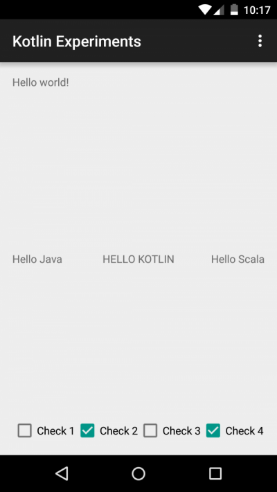例如,在MainActivity.onCreate()中,可應用這段代碼。它將Hello Kotlin!串轉換為大寫字母,選中偶數復選框: