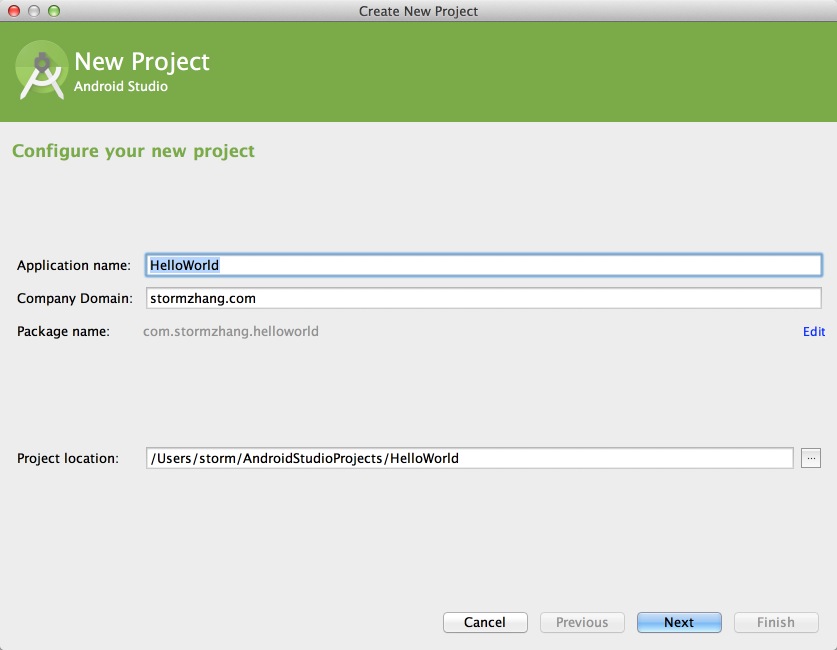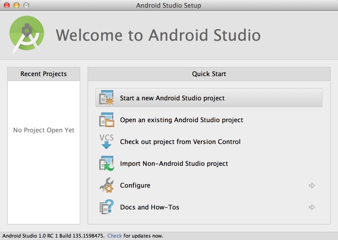 至於安裝就沒什麼可說的了,點擊直接運行了。這裡我以Mac系統的1.0RC版本為例,來創建第一個HelloWorld項目。其他平台基本上差不多,在這之前假設你已經配置好了JDK和Android SDK環境,並且你是第一次安裝Studio。