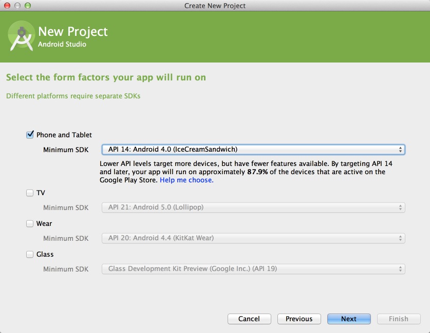 這個頁面支持你適配TV、Wear、Glass等,我們只選擇第一項就ok,選好最小SDK然後”Next”