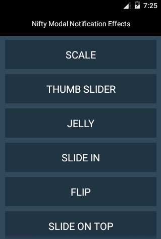 1 <RelativeLayout xmlns:android="http://schemas.android.com/apk/res/android" 2 xmlns:tools="http://schemas.android.com/tools" 3 android:layout_width="match_parent" 4 android:layout_height="match_parent" 5 android:background="#34495E" 6 android:orientation="vertical" 7 tools:context=".MainActivity"> 8 9 <TextView 10 android:id="@+id/title" 11 android:layout_width="match_parent" 12 android:layout_height="48dp" 13 android:background="#000000" 14 android:textColor="#FFFFFF" 15 android:gravity="center" 16 android:text="Nifty Modal Notification Effects" /> 17 <ScrollView 18 android:layout_width="match_parent" 19 android:layout_height="wrap_content" 20 android:layout_below="@+id/title" 21 android:scrollbars="none"> 22 <LinearLayout 23 android:layout_width="match_parent" 24 android:layout_height="wrap_content" 25 android:orientation="vertical" 26 android:padding="5dp"> 27 28 <Button 29 android:id="@+id/scale" 30 31 android:text="SCALE" 32 /> 33 <Button 34 android:id="@+id/thumbSlider" 35 36 android:text="THUMB SLIDER" 37 /> 38 <Button 39 android:id="@+id/jelly" 40 41 android:text="JELLY" 42 /> 43 <Button 44 android:id="@+id/slidein" 45 46 android:text="SLIDE IN" 47 /> 48 <Button 49 android:id="@+id/flip" 50 51 android:text="FLIP" 52 /> 53 <Button 54 android:id="@+id/slideOnTop" 55 56 android:text="SLIDE ON TOP" 57 /> 58 <Button 59 android:id="@+id/standard" 60 61 android:text="STANDARD" 62 /> 63 </LinearLayout> 64 </ScrollView> 65 <RelativeLayout 66 android:id="@+id/mLyout" 67 android:layout_below="@+id/title" 68 android:layout_width="match_parent" 69 android:layout_height="match_parent" 70 android:clipChildren="true" 71 > 72 73 </RelativeLayout> 74 </RelativeLayout>