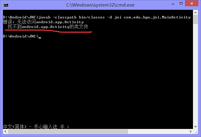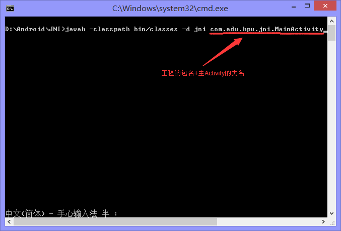 這裡我們主要使用到-d、-jni、 -classpath,下面我們來生成我們的頭文件,在命令行輸入:javah -classpath bin/classes -d jni com.edu.hpu.jni.MainActivity