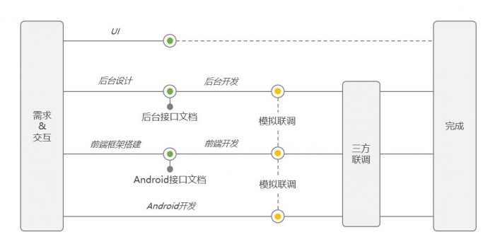從上圖我們可以看出,視覺設計、前端開發、客戶端開發、後台開發都在很大程度上實現了並行開發。