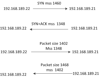 關於TCP MSS的內核設置下面是一個MSS交互的例子,在三次握手的過程中兩個主機捎帶了不同的MSS值,192.168.189.22接口的MTU值為1500,192.16