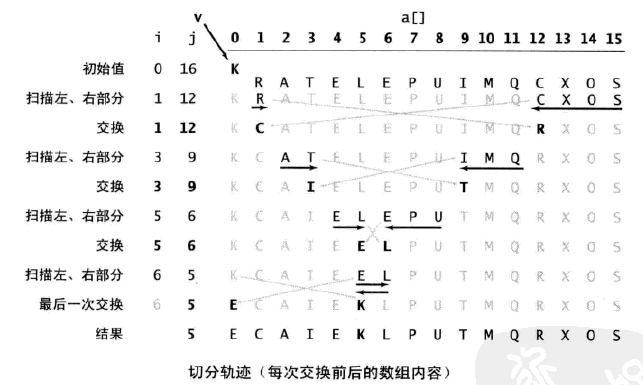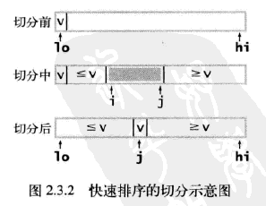 這段代碼按照a[lo]的值v進行切分。當指針i和j相遇時主循環退出。在循環中,a[i]小於v時我們增大i,a[j]大於v時我們減小j,然後交換a[i]和a[j]來保證i左側的元素都不大於v,j右側的元素都不小於v。當指針相遇時交換a[lo]和a[j],切分結束(這樣切分值就留在a[j]中了)。