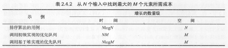 為了展示優先隊列的抽象模型的價值,考慮以下問題:輸入N個字符串,每個字符串都對映著一個整數,你的任務就是從中找出最大的(或是最小的)M個整數(以及關聯的字符串)。這些輸入可能是金融事務,你需要從中找出最大的那些;或是農產品中的殺蟲劑含量,這時你需要從中找出最小的那些;在某些應用場景中,輸入量可能非常巨大,甚至可以認為輸入是無限的。解決這個問題的一種方法是將輸入排序然後從中找出M個最大的元素,但我們已經說明輸入將會非常龐大。另一種方法是將每個新的輸入和已知的M個最大元素比較,但除非M較小,否則這種比較的代價會非常高昂。只要我們能夠高效地實現insert()和delMin(),下面的優先隊列用例中調用了MinPQ的TopM就能使用優先隊列解決這個問題。在現代基礎性計算環境中超大的輸入N非常常見,這些實現使我們能夠解決以前缺乏足夠資源去解決的問題。如表所示