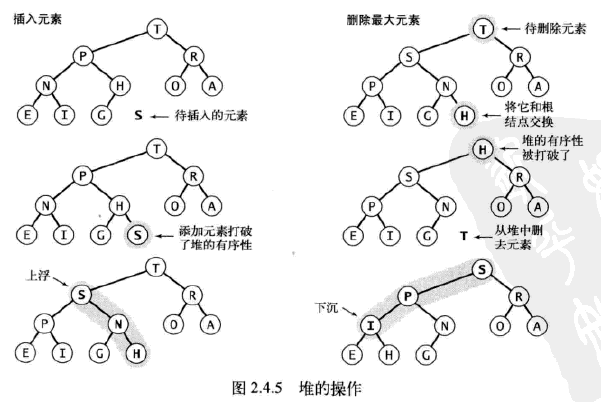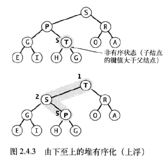 堆的操作會首先進行一些簡單的改動,打破堆的狀態,然後再遍歷堆並按照要求將堆的狀態恢復。我們稱這個過程叫做堆的有序化。在有序化的過程中我們會遇到兩種情況。當某個結點的優先級上升(或是在堆底加入一個新的元素)時,我們需要由下至上恢復堆的順序。當某個結點的優先級下降(例如將根結點替換為一個較小的元素)時,我們需要由上至下恢復堆的順序。首先,我們會學習如何實現這兩種輔助操作,然後再用它們實現插入元素和刪除最大元素的操作。