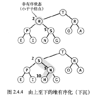 如果堆的有序狀態因為某個結點變得比它的兩個子結點或是其中之一更小了而被打破了,那麼我們可以通過將它和它的兩個子結點中的較大者交換來恢復堆。交換可能會在子結點處繼續打破堆的有序狀態,因此我們需要不斷地用相同的方式將其修復,將結點向下移動直到它的子結點都比它更小或是到達了堆的底部。由位置為k的結點的子結點位於2k和2k+1可以直接得到對應的代碼。