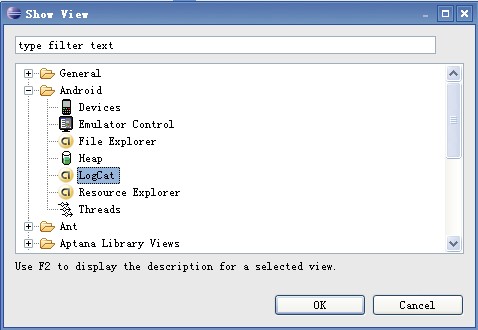 啟動Eclipse,在Window->Show View會出來一個對話框,當我們點擊Ok按鈕時,會在控制台窗口出現LogCat視窗.如下圖: