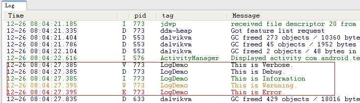 android.util.Log常用的方法有以下5個:Log.v() Log.d() Log.i() Log.w() 以及 Log.e() 。根據首字母對應VERBOSE,DEBUG,INFO, WARN,ERROR。