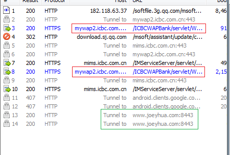 紅框的是工行的接口,藍色文字表示抓到數據,具體數據就不發了,是我自己的賬號。綠色框的是我自己的服務端的接口,因為做了處理所以沒有被抓顯示的是灰色文字。上圖必須要用偽裝證書,否則直接抓取同一個接口也抓不到的。
