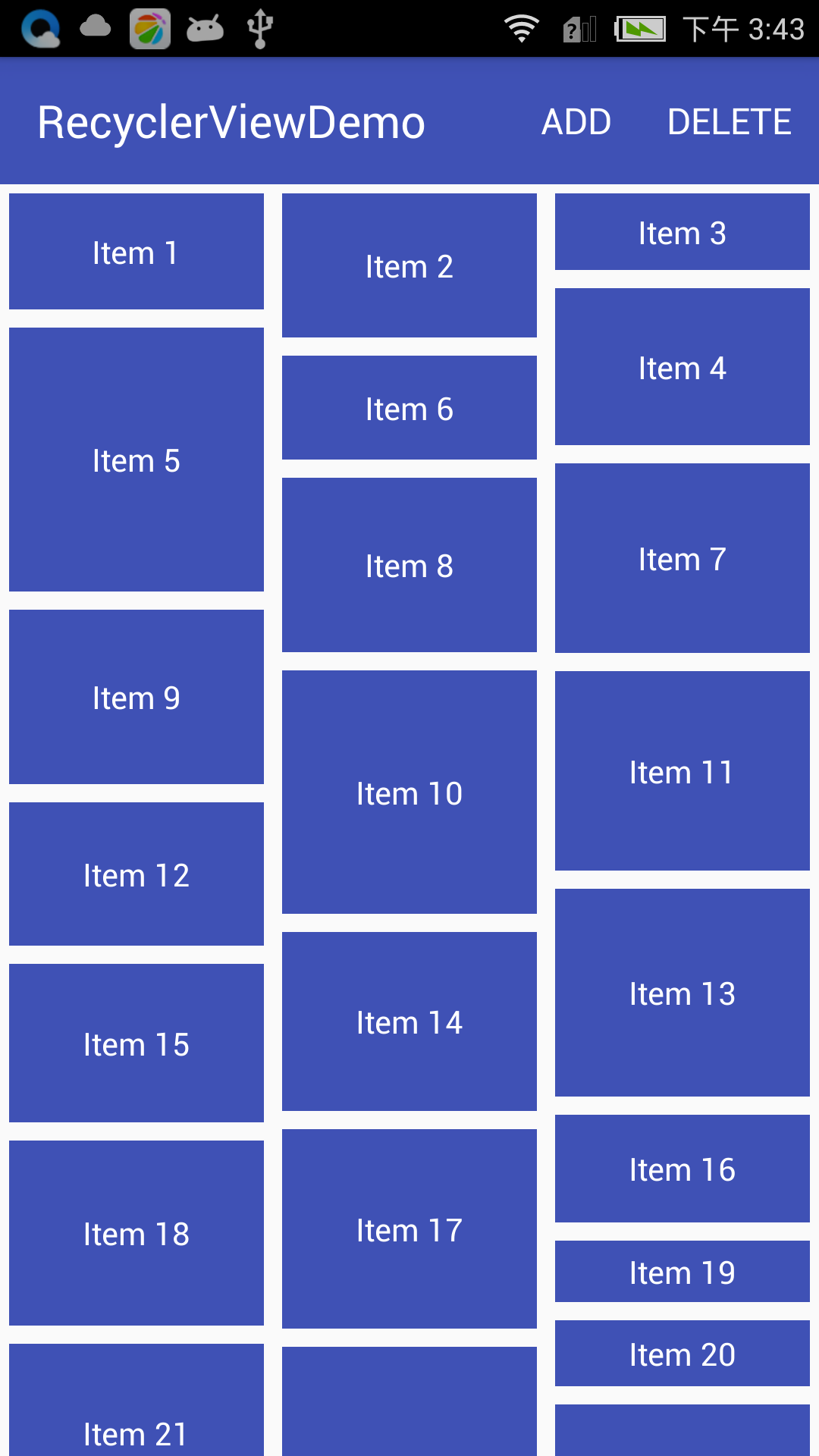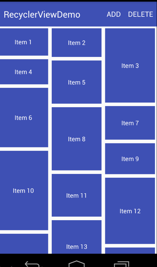 recyclerView.setLayoutManager(new StaggeredGridLayoutManager(3, StaggeredGridLayoutManager.VERTICAL));