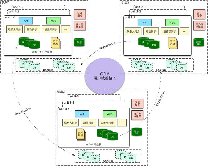 我們把業務數據和服務打包到單個Unit,一個Unit服務一定數量的用戶。每個Unit包含了完整的數據和服務,可以單獨部署。每個機房有多個Unit,每個用戶的數據在本地有一份備份、在遠程同樣也有一份備份。當機房故障時,可以把備份數據拉起來服務用戶。