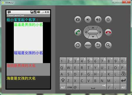 線性布局是所有布局中最常用的類之一,也是RadioGroup, TabWidget, TableLayout, TableRow, ZoomControls類的父類。LinearLayout可以讓它的子元素垂直或水平的方式排成一行(不設置方向的時候默認按照垂直方向排列)。