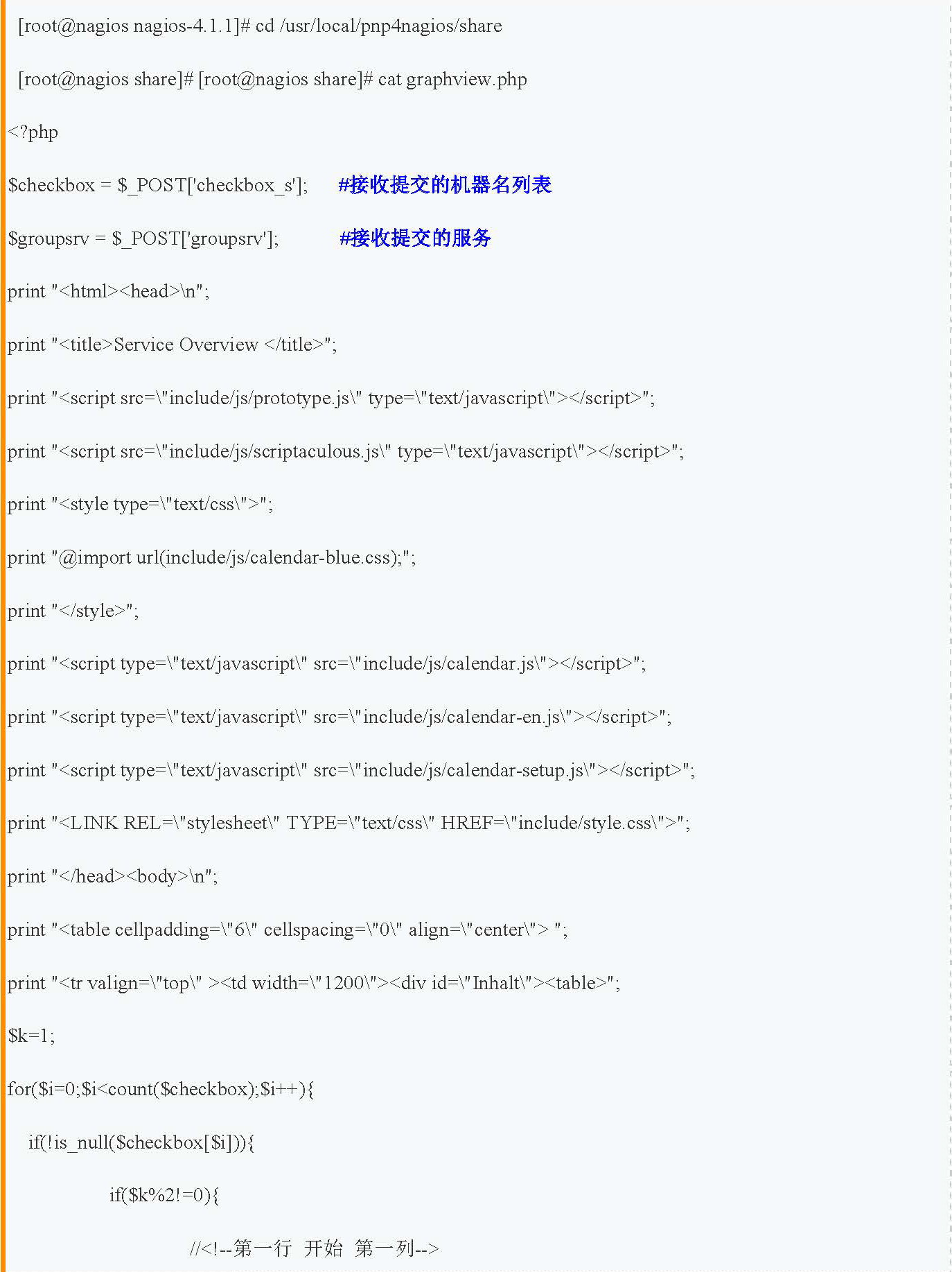 看到了麼?單擊“View”按鈕後,觸發的動作是位於pnp4nagios目錄中的graphview.php文件。出圖的實現實在這個php文件裡完成的。這裡的出圖我們還是沿用nagios既定的rrdtool畫圖方式,堅持的原則是滿足需求的前提下,盡量避免重復造輪子,畢竟那是需要花時間的,公司也不會給我們那麼多時間。同樣,沿用了rrdtool出圖,那麼具體的出圖代碼怎麼辦呢?復用,當然是復用了。關鍵是看怎麼復用?
