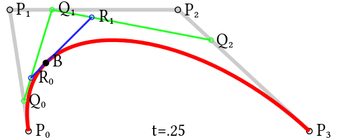 B點(t)的變化從Q0(t)到Q1(t),描述了一個二次Bézier曲線。