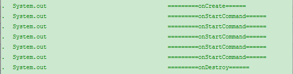 此時運行程序,點擊開啟服務時候輸出是下圖:(我輸出多次onStartCommand()是因為我連續點擊了多次開啟服務按鈕)