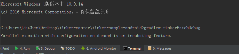 然後可以修改你的bug了,修改好之後在As的terminal終端使用命令行 gradlew tinkerPatchDebug,可不能直接用你自己的apk改個名字就丟上去了,那樣就over了