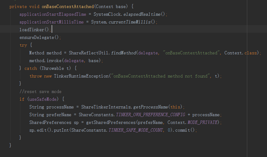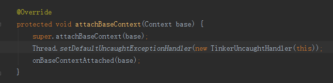 SampleApplication是gradle自動生成的,繼承自 TinkerApplication ,然後設置捕捉代碼異常,onBaseContextAttached就是我們要找的關鍵代碼了