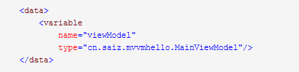 要實現 MVVM 的 ViewModel 就需要把數據與UI進行綁定,data 節點就為此提供了一個橋梁,我們先在data 中聲明一個 variable,這個變量會為 UI 元素提供數據(例如 TextView 的 android:text),然後在代碼中把”後台”數據與這個 variable 進行綁定。