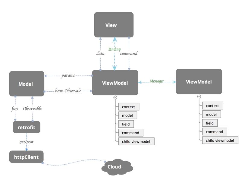 Model: 實體模型,同時包括Retrofit 的Service ,ViewModel 可以根據Model 獲取一個Bean的Observable<Bean>( RxJava ),然後 做一些數據轉換操作和映射到ViewModel 中的一些字段,最後把這些字段綁定到View層上。