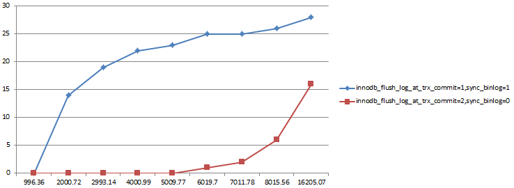 可以發現在Slave被配置為"雙1"的情況下,延遲非常嚴重,1000以上的qps就會出現延遲,非"雙1"下qps到5000以上才會出現延遲(主庫配置為"雙1")。