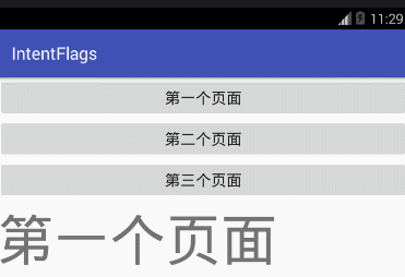 1 <?xml version="1.0" encoding="utf-8"?> 2 <LinearLayout 3 xmlns:android="http://schemas.android.com/apk/res/android" 4 xmlns:tools="http://schemas.android.com/tools" 5 android:id="@+id/activity_main" 6 android:layout_width="match_parent" 7 android:layout_height="match_parent" 8 android:orientation="vertical" 9 tools:context="com.example.administrator.intentflags.MainActivity"> 10 <Button 11 android:text="第一個頁面" 12 android:layout_width="match_parent" 13 android:layout_height="wrap_content" 14 android:onClick="click1" /> 15 <Button 16 android:text="第二個頁面" 17 android:layout_width="match_parent" 18 android:layout_height="wrap_content" 19 android:onClick="click2" /> 20 <Button 21 android:text="第三個頁面" 22 android:layout_width="match_parent" 23 android:layout_height="wrap_content" 24 android:onClick="click3" /> 25 <TextView 26 android:layout_width="match_parent" 27 android:layout_height="match_parent" 28 //其余兩個僅文字不一樣 29 android:text="第一個頁面" 30 android:textSize="50sp"/> 31 </LinearLayout>