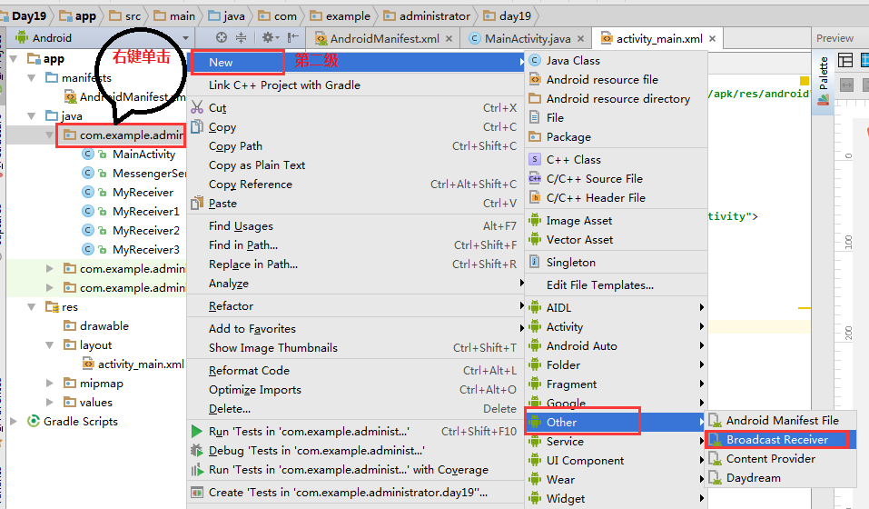 靜態注冊建立第一步,新建BroadcastReceiver,見下圖: