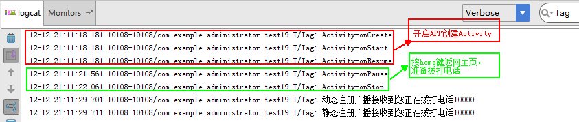 (5)通過接受打電話的廣播,在程序(Activity)運行時和終止運行時,對兩種注冊方式的比較