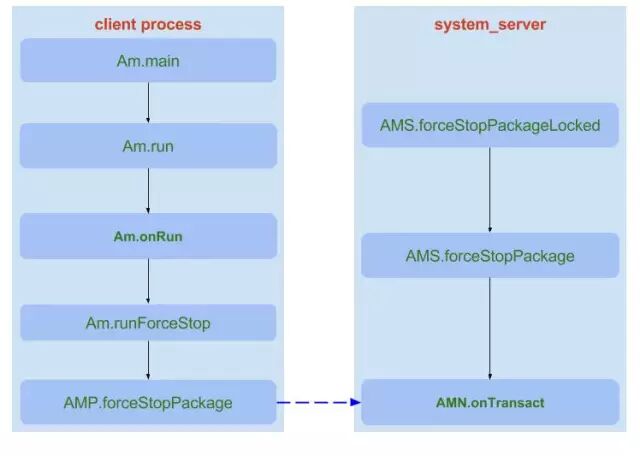 MP.forceStopPackage來運行在執行adb時所創建的進程,經過Binder Driver後,進入system_server進程的一個binder線程來執行AMN.forceStopPackage,從這開始的操作(包括當前操作)便都運行在system_server系統進程。