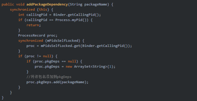 進程的pkgList是在啟動組件或者創建進程的過程向該隊列添加的,代表的是該應用下有組件運行在該進程。那麼pkgDeps是指該進程所依賴的包名,調用ClassLoader的過程添加。