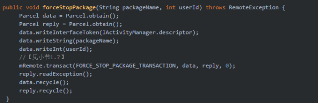 至於force-stop的觸發方式,除了adb的方式,還可通過獲取ActivityManager再調用其方法forceStopPackage(),不過這是@hide隱藏方法,同樣是需要具有FORCE_STOP_PACKAGES權限。雖然第三方普通app不能直接調用,但對於深入理解Android,還是很有必要知道系統是如何徹底清理進程的過程。接下來,進入AMS來深入探查force-stop的內部機理。