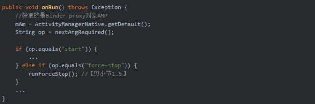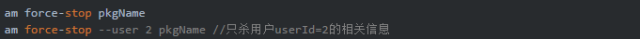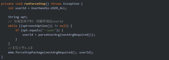 force-stop命令殺掉所有用戶空間下的包名pkgName相關的信息,也可以通過--user來指定用戶Id。 當執行上述am指令時,則會觸發調用Am.java的main()方法,接下來從main方法開始說起。