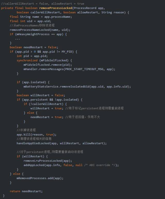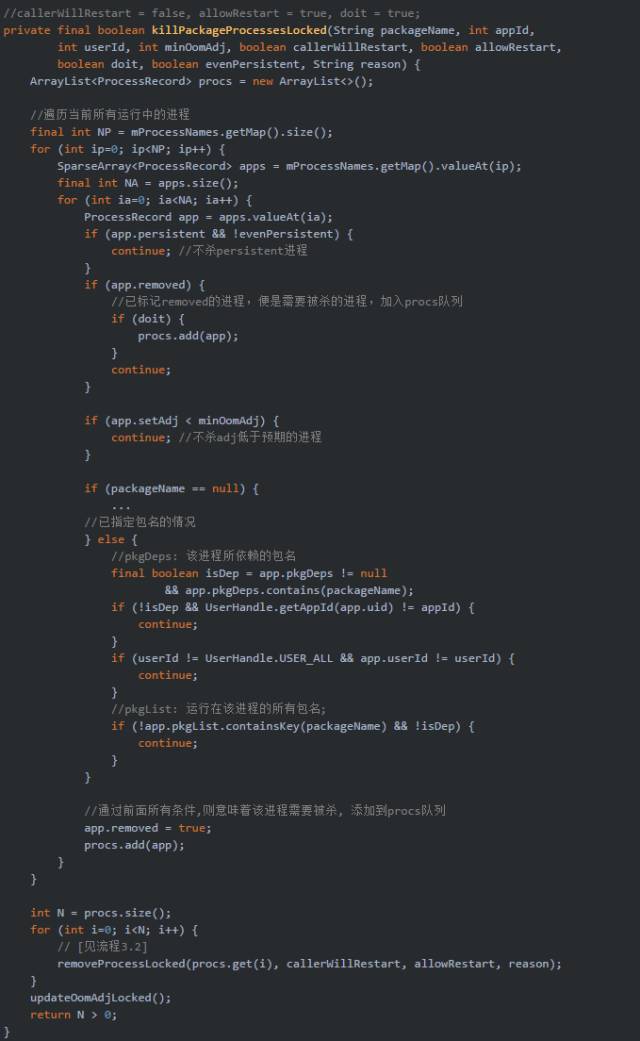 對於didSomething只指當方法中所有行為,則返回true.比如killPackageProcessesLocked(),只要殺過一個進程則代表didSomething為true.