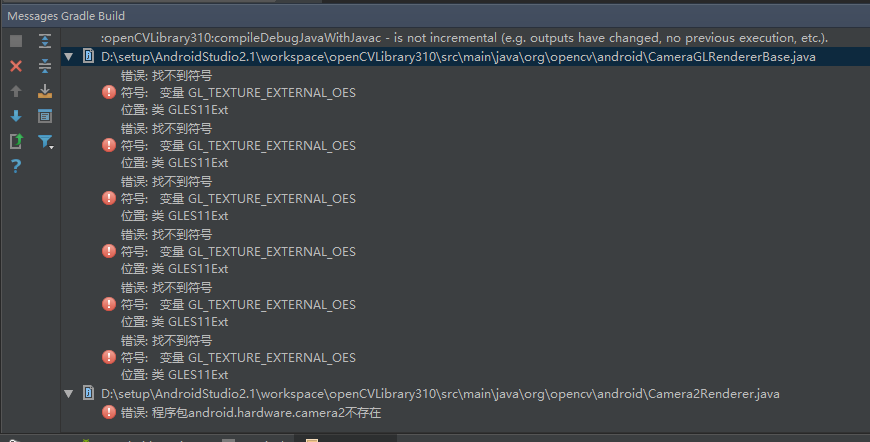 解決:導入OpenCV for Android後應該將openCVLibrary310下的build.gradle文件改成和第一步自己新建的android項目下的build.gradle文件相同,然後clean一下,OK