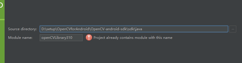 2.Source directory中填寫內容:找到步驟1中解壓OpenCV for Android的位置OpenCV-android-sdk —> sdk—> java直接拷貝,拷貝完畢後會出現Module name(我的因為已經導入過了所以會有感歎號正常情況下點擊下一步下一步下一步就好)