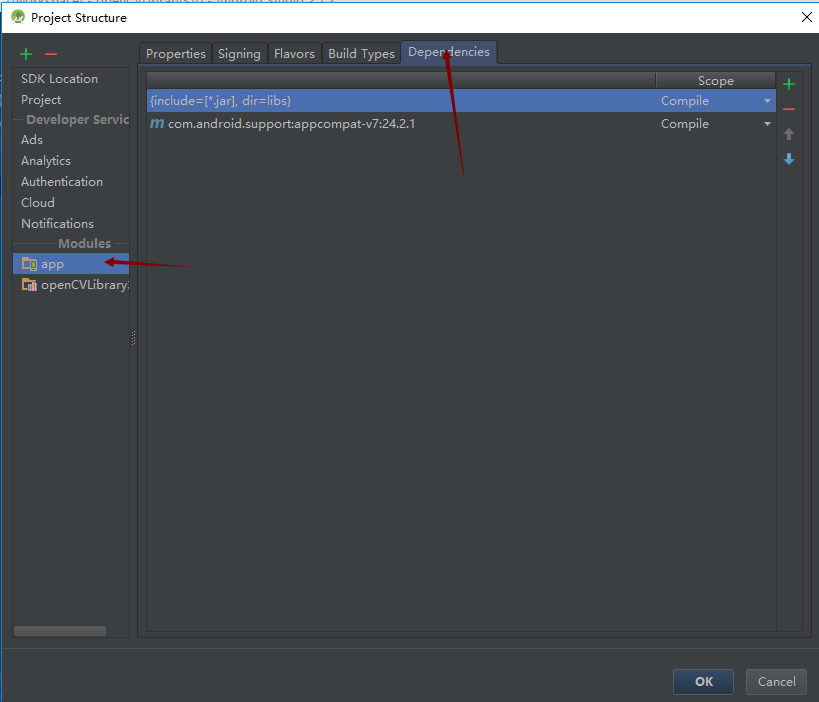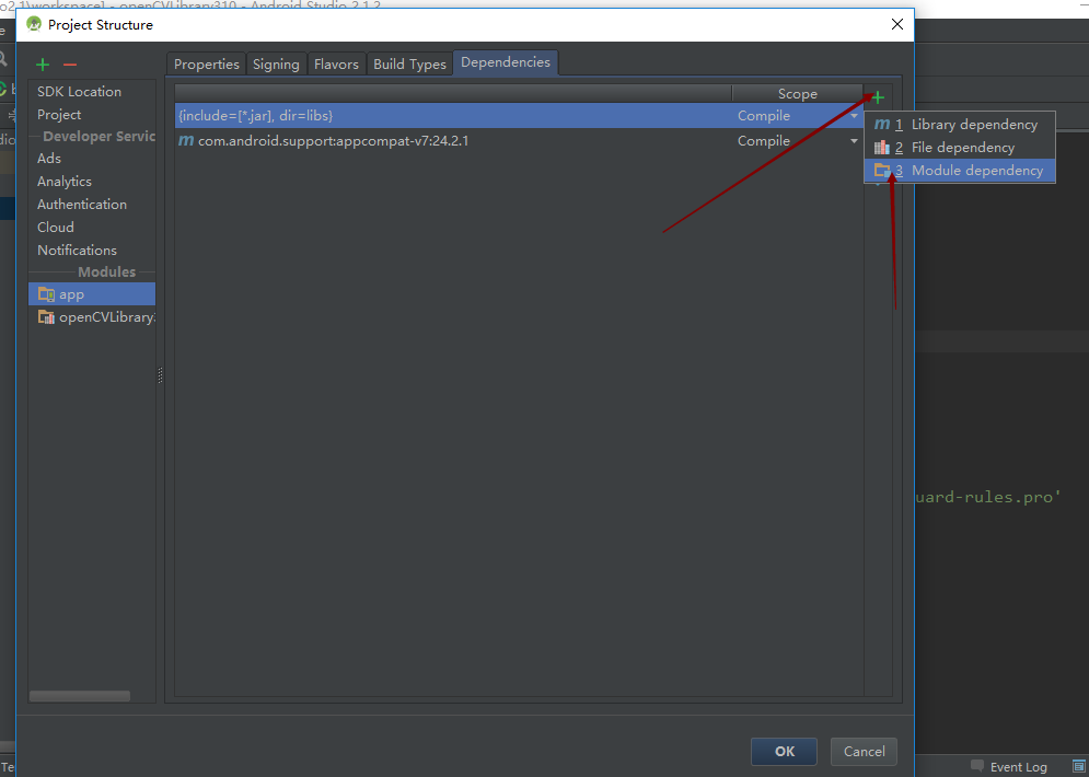 2.點擊右側加號選第三個Module dependency後選擇openCVLibrary310後點擊完成