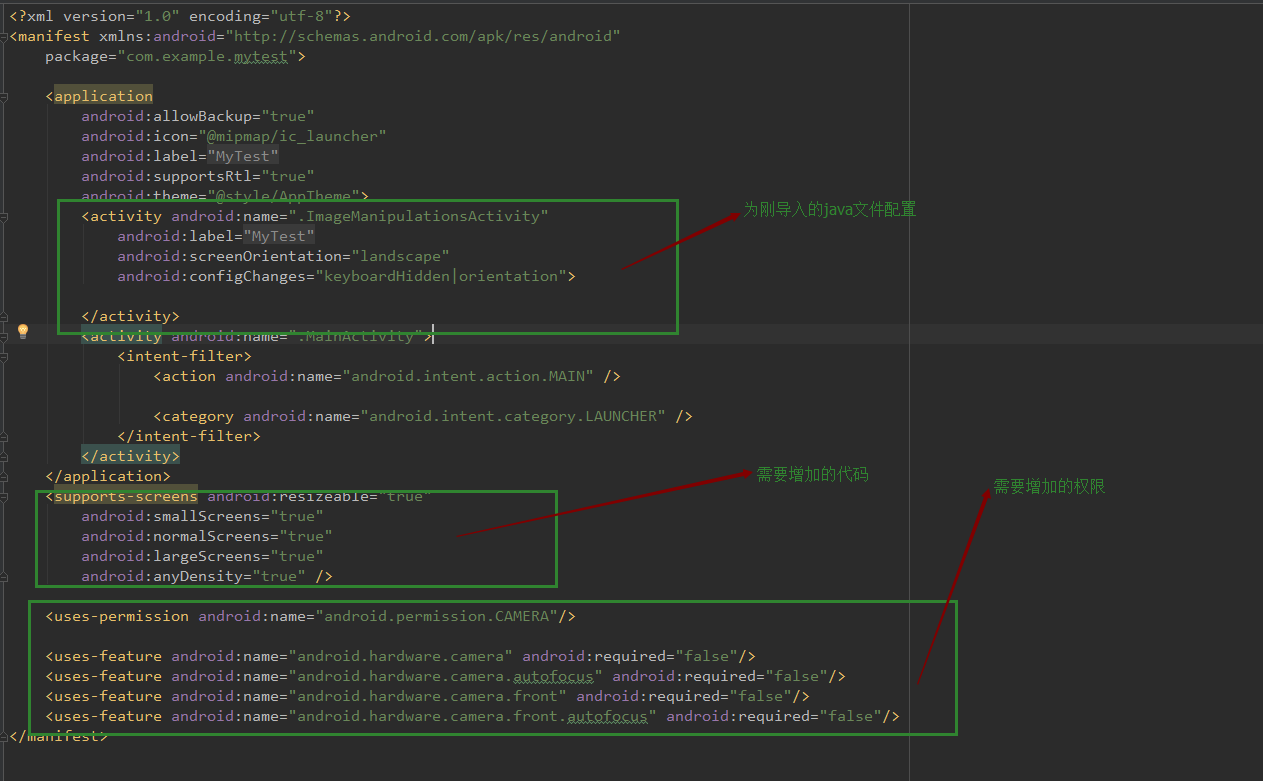 4.在項目清單文件中為剛才導入的java文件進行配置,加上相應的權限,如圖: