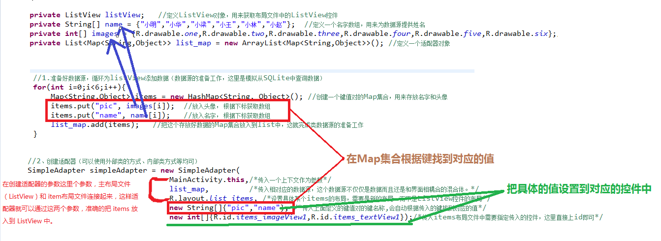 list_map.add(items); //把這個存放好數據的Map集合放入到list中,這就完成類數據源的准備工作