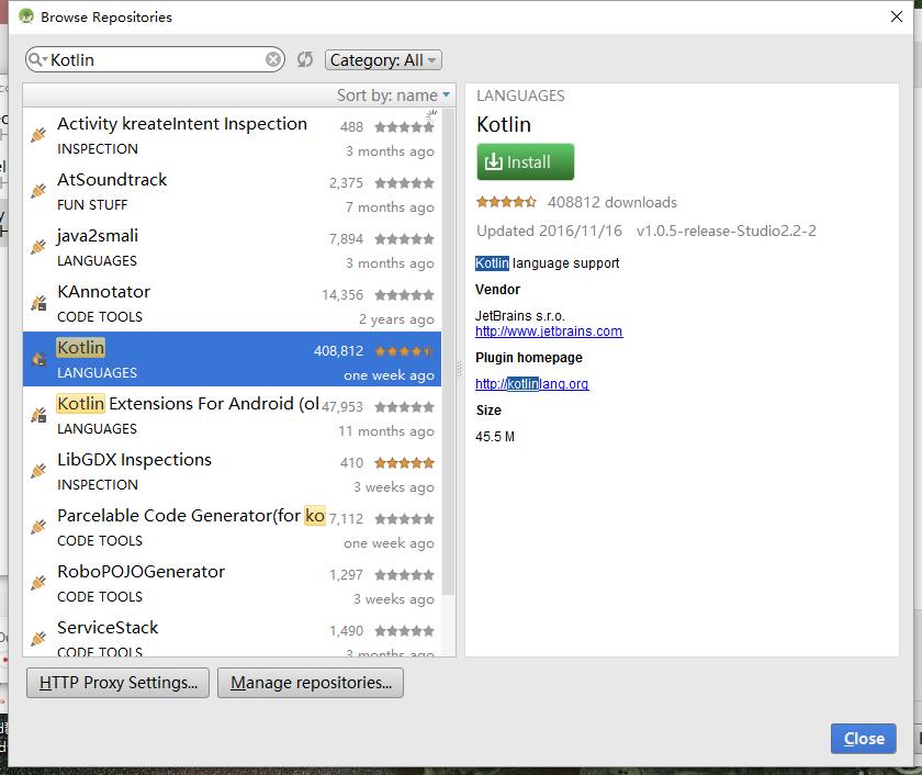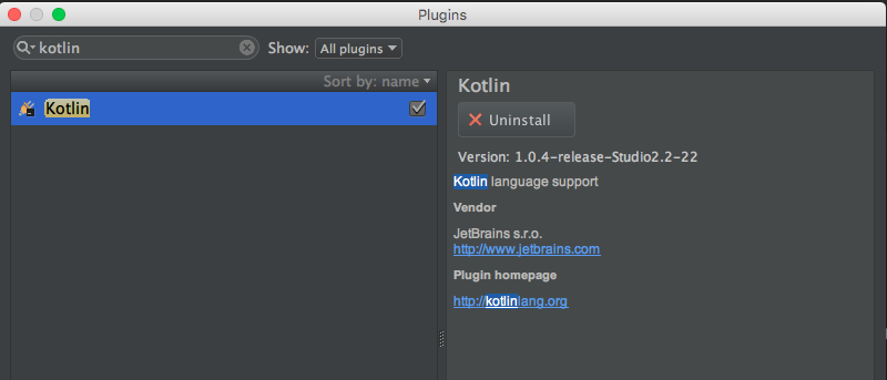 一旦完成後,安裝Kotlin插件。IntelliJ有默認安裝,但是與Android Studio不相同。