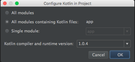 另一個實用插件可以為你做這個轉換。只需去到Tools -> Kotlin -> Configure Kotlin in Project,在這個對話框中加一些改變到build.gradle文件中: