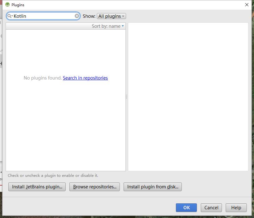 而在Plugins找不到Kotlin,需要點擊對話框中“Search in repositories”鏈接: