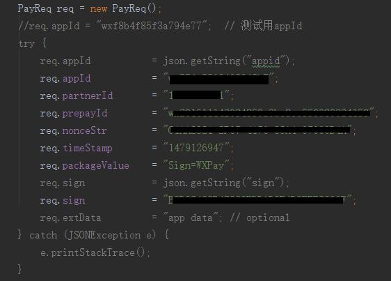 上面是把demo裡面的服務號訪問注釋了,直接寫死的,原來是調用後台接口返回,文檔上每個字段都有說明作用,要注意字段別亂增加,不然sign會不一致,至於這些數據就別用官方的了,跟後台要一個服務數據,這樣就能直接調起微信支付了,支付成功後訂單完成