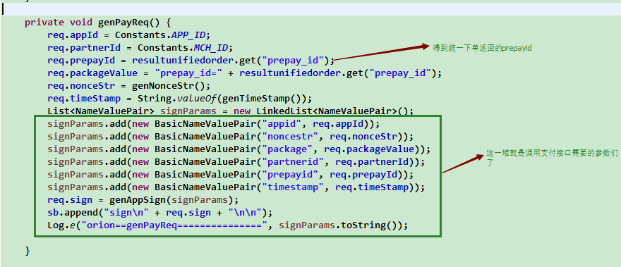signParams.add(new BasicNameValuePair("prepayid", req.prepayId));