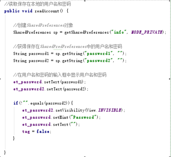 使用SharedPreferences儲存用戶名和密碼,SharedPreferences是直接處理xml文件,不需要做字符串分割,存儲效率會比使用內部存儲,和外部存儲存儲用戶名和密碼高。